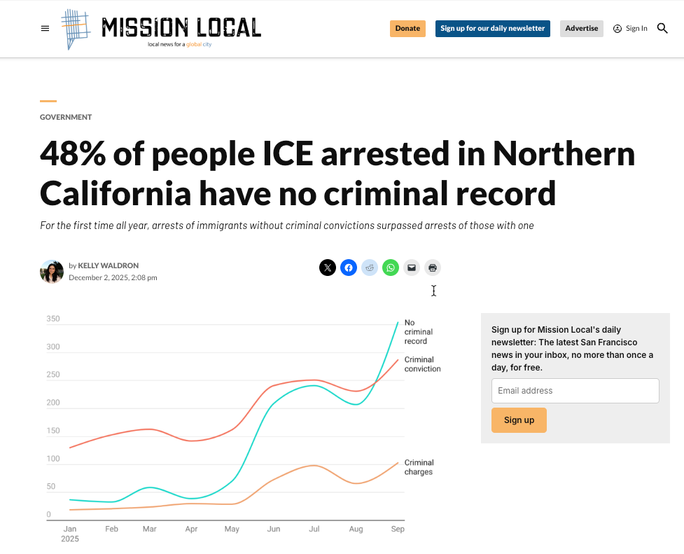 Some stories have focused on local law enforcement’s cooperation with ICE, such as Suncoast Searchlight’s analysis of detainers in Florida, or the University of Maryland’s Howard Center stories on a few rural sheriffs becoming responsible for many of the arrests across the state.